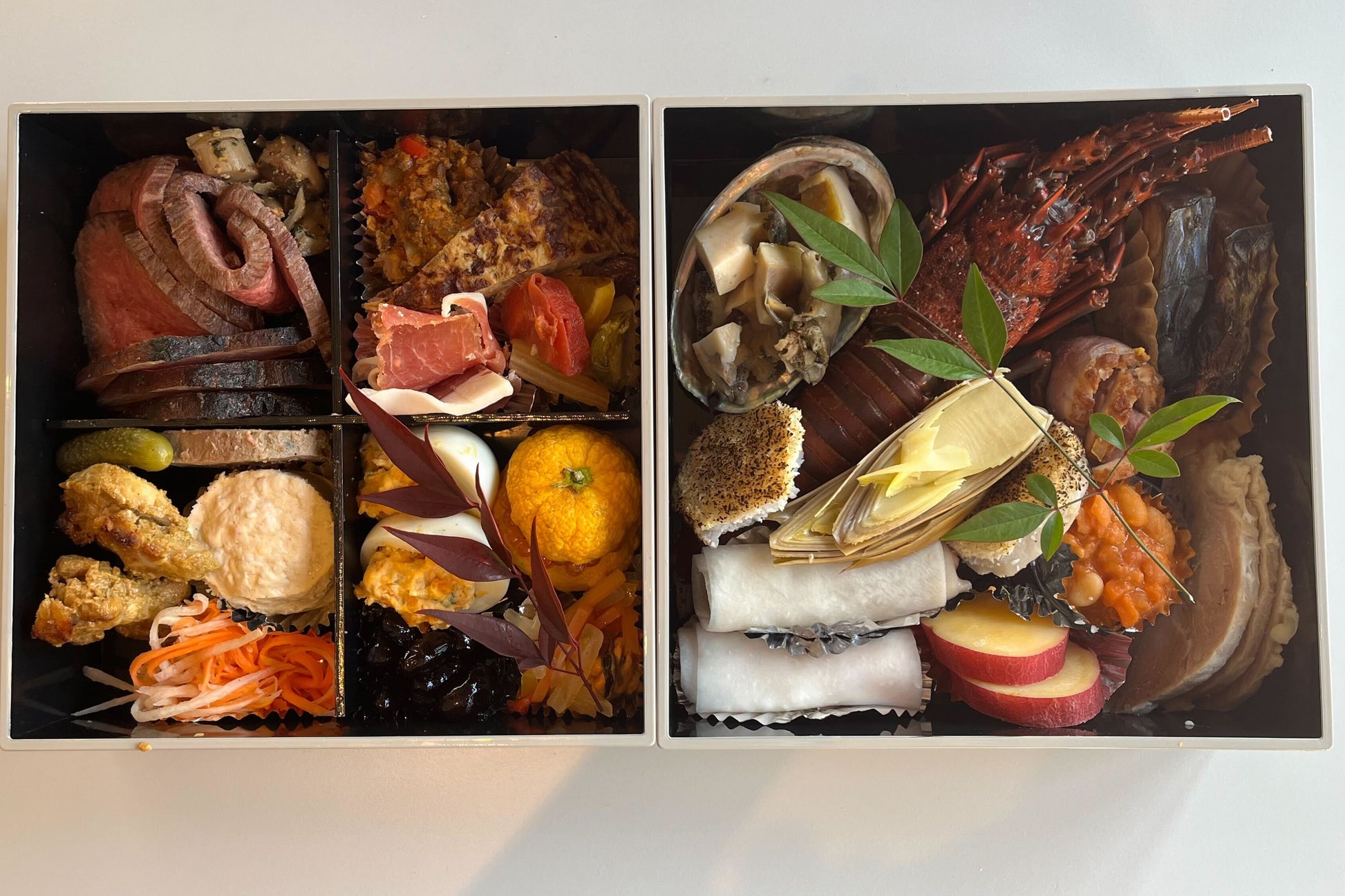 京都岩倉にある、京野菜を使ったフレンチのお店『エヴァンタイユ』さんならではのシェフのお任せのおせちです。伊勢海老・あわび・フォアグラ・黒毛和牛のローストビーフ・鴨のローストなど新年のお祝いの食材が盛り込まれ、フレンチの調理で手間ひまをかけたこだわりの食材が詰め込まれています。