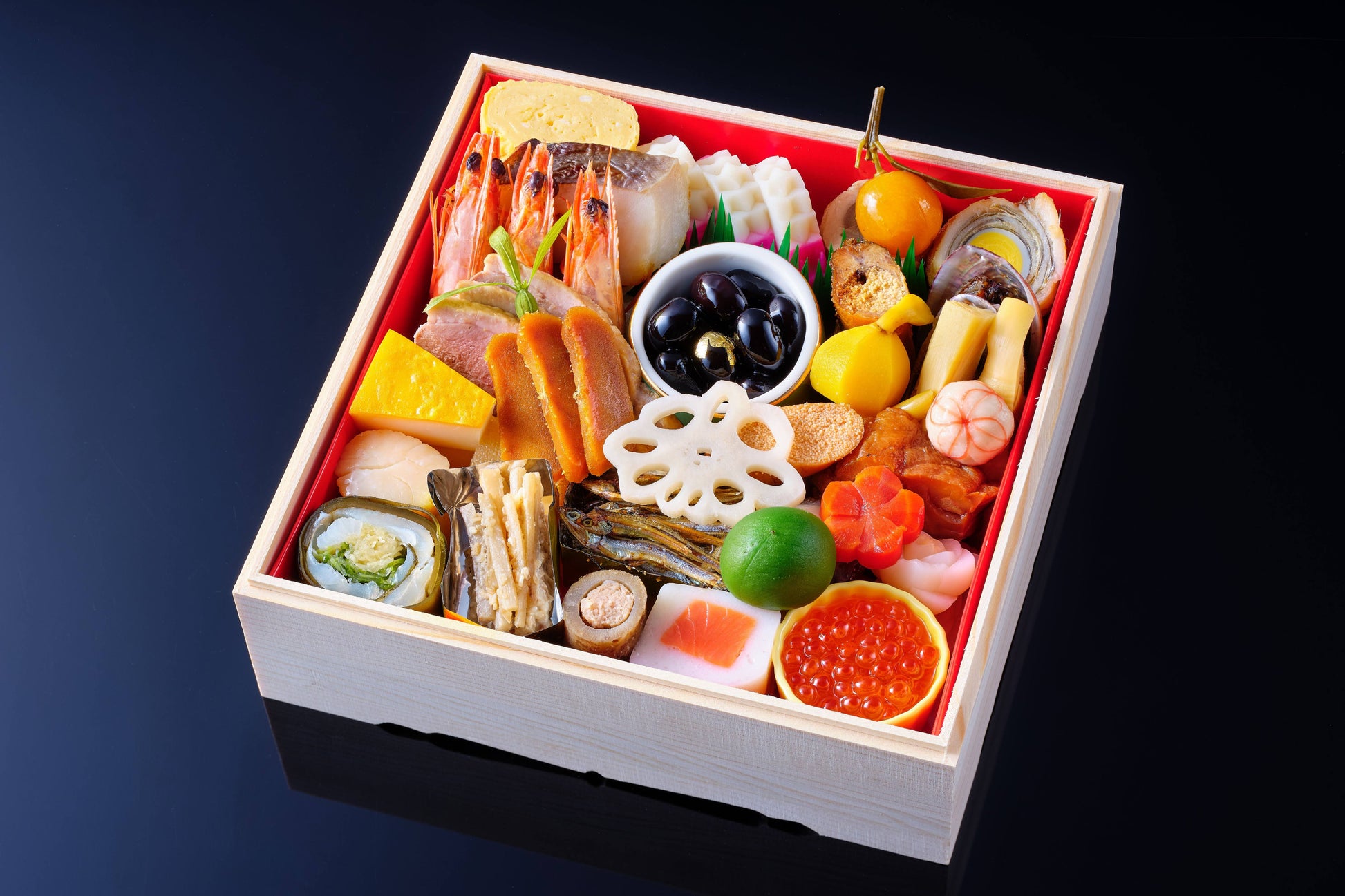 いくら醤油漬け、花蓮根酢漬け、葉付金柑蜜煮、筍土佐煮、梅人参、手まり麩、帆立貝柱西京焼、紋甲烏賊黄身焼、子持鮎甘露煮、六方くわい煮、門松牛蒡、花百合根甘露煮、裏白椎茸、竜眼穴子、鶏肉八幡巻、床節旨煮、車海老つや煮、真名鰹西京焼、からすみ、鰻八幡巻、サーモン小川巻、助子旨煮、出し巻き、京鴨スモーク、味付数の子、平目求肥巻、鹿の子蒲鉾、田作り、たたき牛蒡、丹波黒豆蜜煮、棒鱈煮、青梅甘露煮