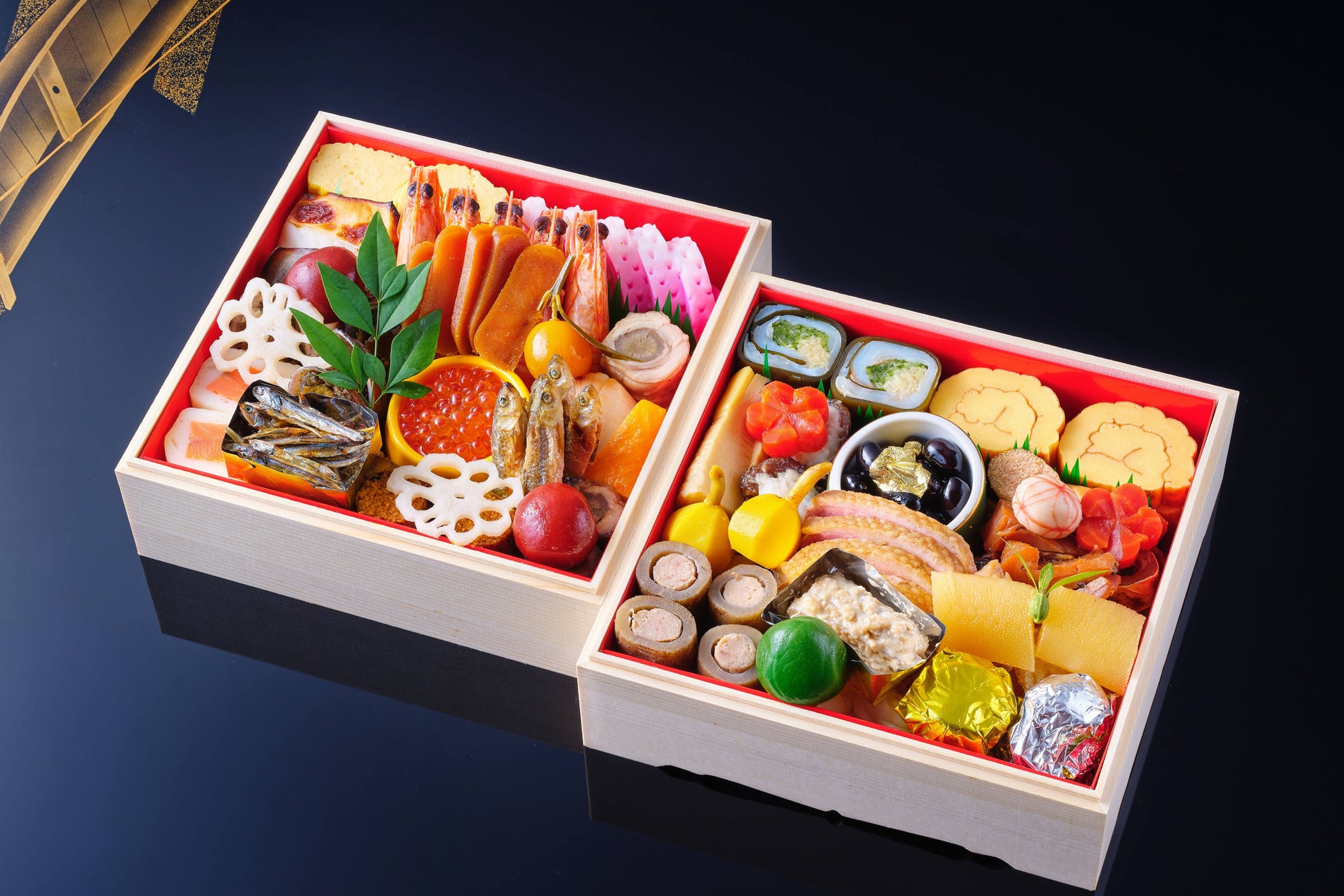 いくら醤油漬け、花蓮根酢漬け、帆立貝柱西京焼、紋甲烏賊黄身焼、子持鮎甘露煮、竜眼穴子、鶏肉八幡巻、床節旨煮、車海老つや煮、真名鰹西京焼、からすみ、鰻八幡巻、サーモン小川巻き、出し巻き、鹿の子蒲鉾、田作り、赤梅甘露煮、諸子南蛮漬け、葉付金柑蜜煮