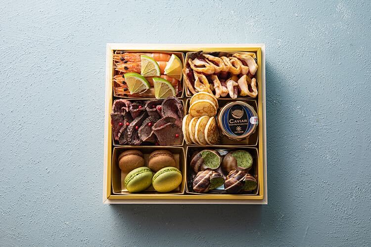 京都上賀茂のルルソンキボアさんのおせちです。新年の始まりにふさわしく高級食材を贅沢に盛り込まれています。ワインに合う繊細で優美なおせちをご堪能できます。