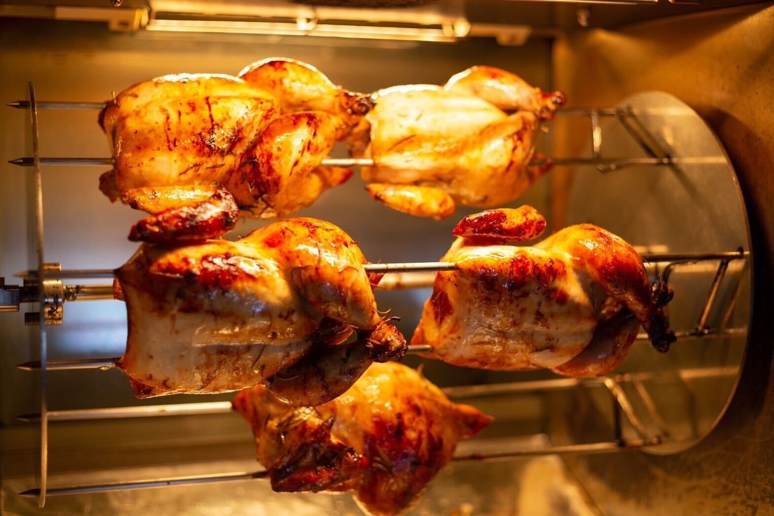 オリーブオイル、塩、レモン、ニンニク、ハーブ、白ワインで3日程マリネした丸鶏を、本場フランスから取り寄せたロティサリーオーブンで回しながらじっくり焼き上げております。